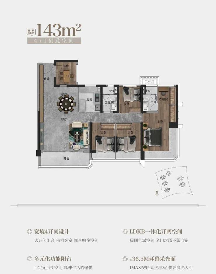 143㎡户型,南向宽景4开间设计 | 约36.5M环幕采光面 | 270°环幕瞰景主卧|多元化功能阳台