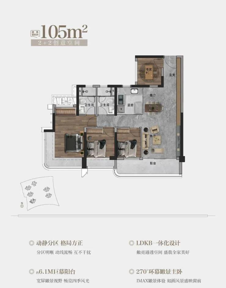 105㎡户型,约6.1M巨幕阳台 | 270°环幕瞰景主卧|LDKB一体化设计