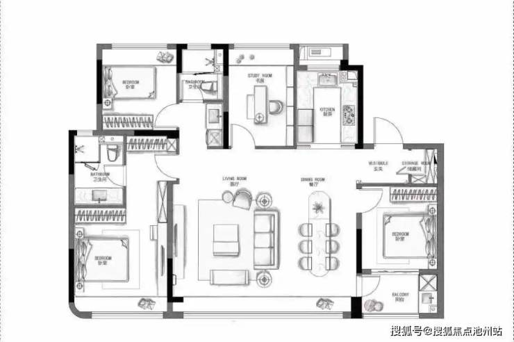 这一户型是4房2厅3卫的房屋套型;4开间朝南,南向双卧室套房设计;客厅为大宽厅设计, 开间为5.8米;阳台是双开间设计,开间为9.1米;不过同样的这一户型的阳台也是有两种设计;主卧套房设计,带有一个四段式卫浴间,双台盆+浴缸,270度观景飘窗;北向有一个阳台,可以用作生活阳台;