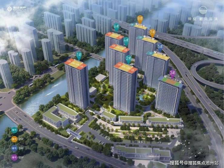 项目由8幢高层住宅组成,其中1幢、2幢、4幢、6幢为28F,7幢、8幢为25F,5幢为24F,3幢(自持)为18F。
