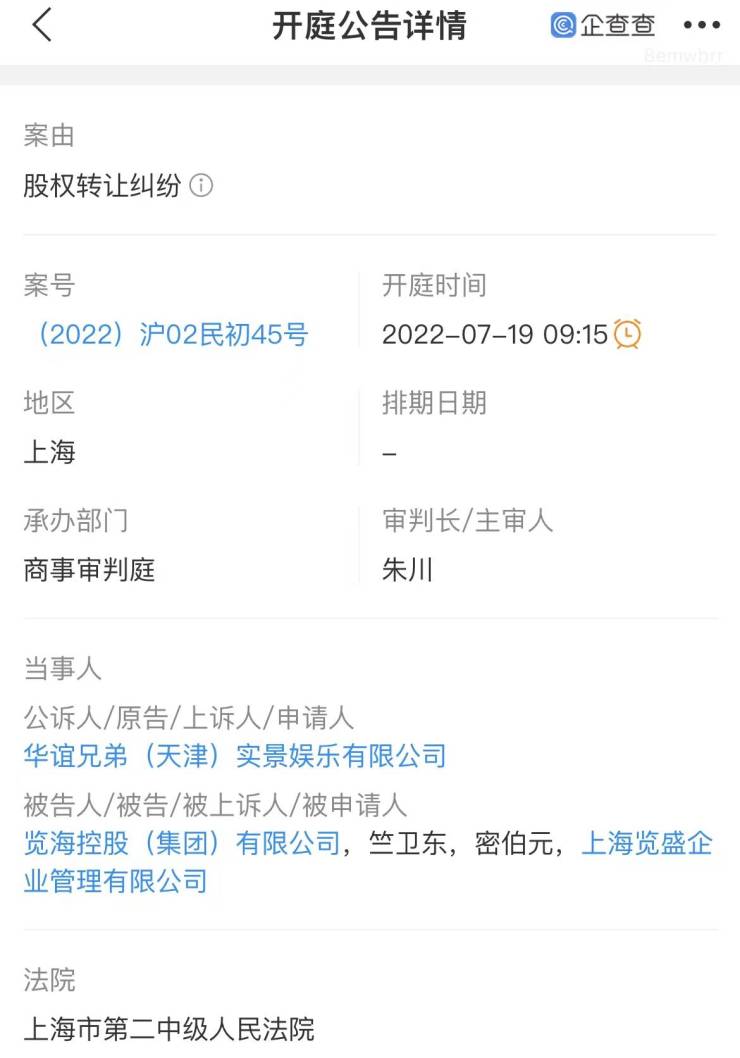 除此之外,华谊兄弟还将密伯元(密春雷父亲)、上海览盛、览海控股(集团)以股权转让纠纷,告上了法庭。7月19日,双方将在上海第二中级人民法院开庭。