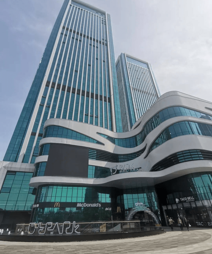 乘坐地铁2号线出发,到达钱江世纪城站并往E、F出口方向走,首先映入眼前的是站前町地下商业街。时值中午饭点,地铁客流一部分汇聚于此,餐饮业态为主的地下商业街十分热闹。从地铁站F1口出来,两幢35层双子塔建筑+5层商业裙楼组成的综合体坐落于此,而这个5层商业建筑就是今天的主角——朝龙汇D+PARK了。周边高楼林立,而阳光下的蓝色玻璃外墙让这个综合体显得别具一格。同时商场外围的涂鸦“小房子”及门口的美陈也让笔者对这个商场充满期待。然而“期待越大,失望越大”。