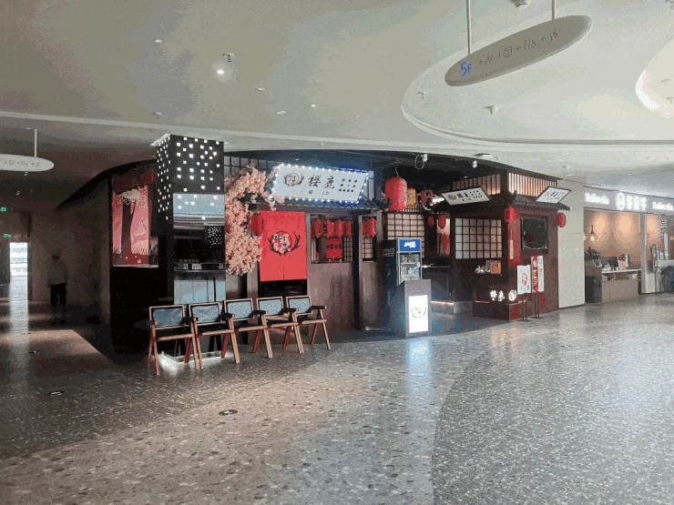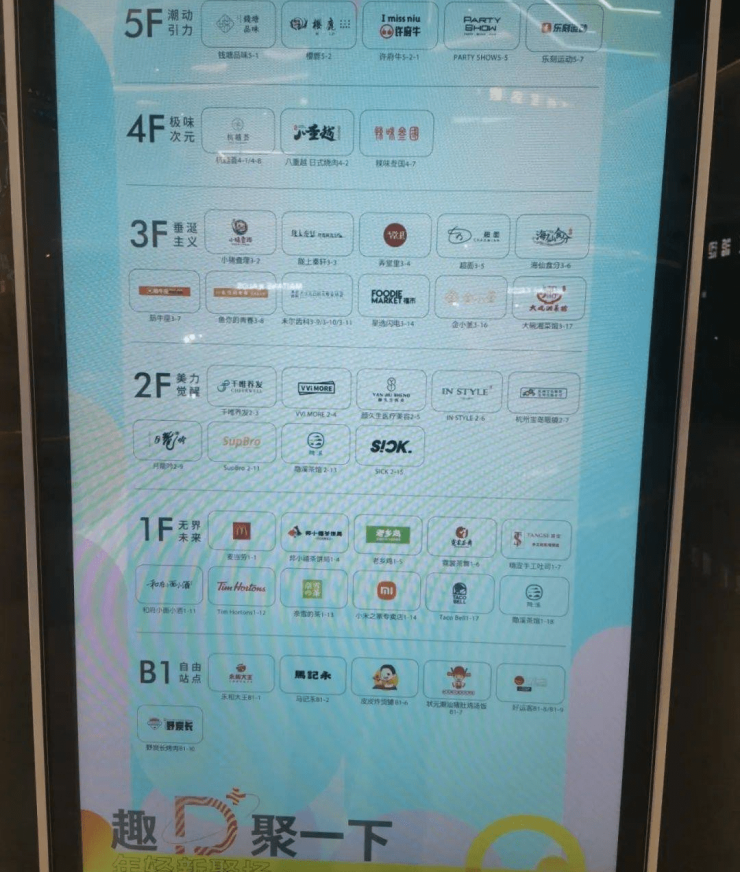 餐饮业态品牌集中分布于B1层、1F、3F、4F和5F。其中商场的1F和3F餐饮类品牌较多,中午饭点时分,聚集在这两层的客流也最多。但1F除老乡鸡、和府小面小酒、奈雪的茶等几家知名餐饮品牌外,像其他服饰类配套业态店铺却极为“冷清”。3F是商场的人气担当,聚集了包括小猪查理、陇上秦轩、弄堂里、大碗湘菜馆(未开业)在内的10家餐饮品牌,此外西南侧还入驻了一家未尔齿科。2F的业态较为多元,涵盖美容美发、服饰等业态,其中引进IN STYLE等4家美容美发业态品牌。此外,该层楼还入驻了月龙吟日料店和隐溪茶馆两家店,“幽静”的店铺跻身于一众美容美发、服饰类品牌店铺中,稍显怪异。这层楼,中午的客流量并不多,IN STYLE的客流还算勉强。4F仅引进八重越、辣味三国、满堂彩(未开业,大众点评显示为杭越·满堂彩,曾用名:杭越荟)三家餐饮品牌,5F则引进钱塘品味、樱鹿、许府牛、PARTY SHOW和乐刻运动共5家品牌。这两层的大面积空铺,客流量也不如1F和3F。B1层共入驻了6家店铺。在品牌上没有太大新意,引进马记永、永和大王常见品牌外,还有几家类似普通底商品牌。整体上看,商场有点像写字楼的生活配套,除餐饮和美容美发类配套业态,客流较多,其他业态店铺则较为“惨淡”。