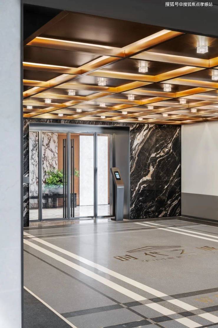 用料上,部分以冰火板+岩板打造的车行道廊柱、仿透光云石定制车牌号、部分主干道全铝板吊顶,无不显示出业主的归家气场。