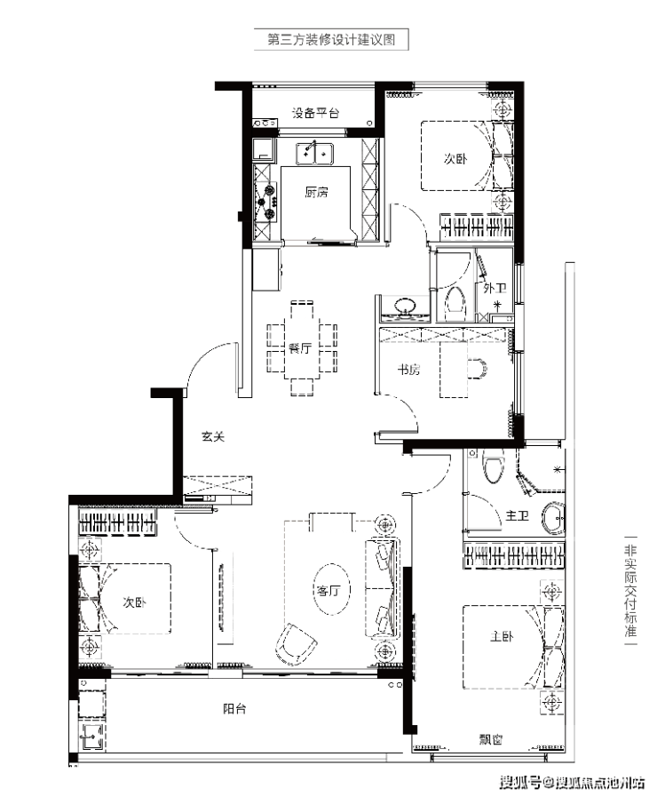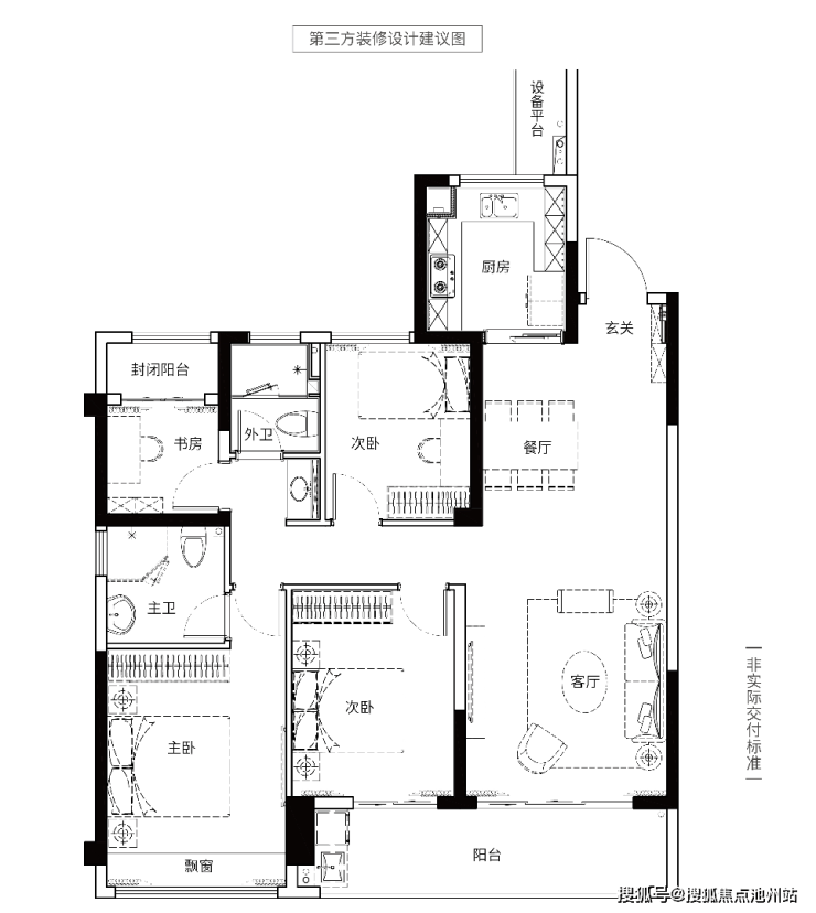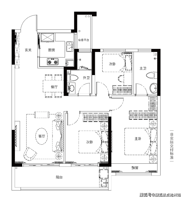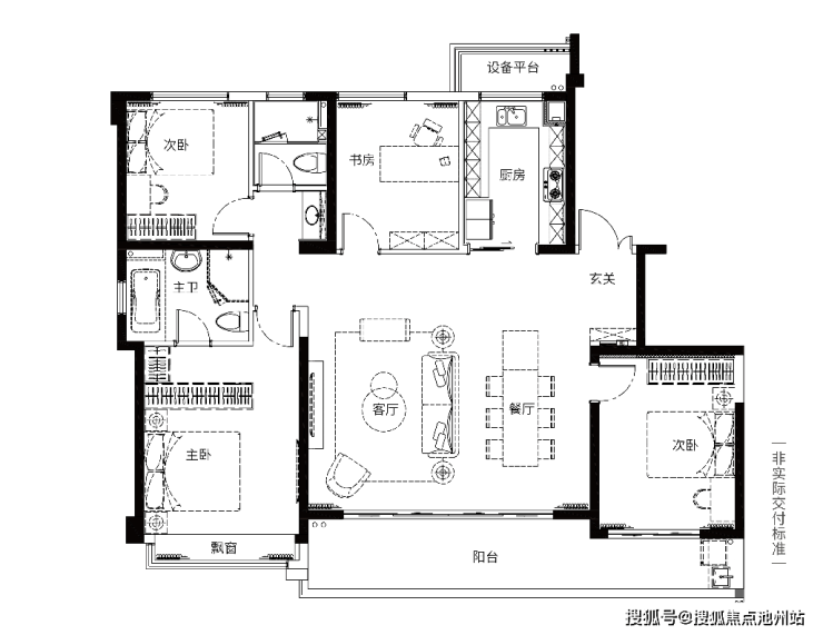 四房两厅两卫户型,餐客厅一体,南向三联阳台。