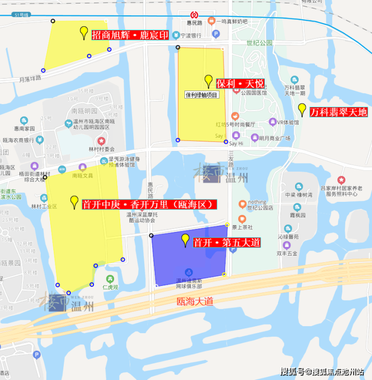 项目北面为规划住宅用地、在建24班小学及温州市城市绿轴幼儿园(瓯海二幼集团化办学),南面为瓯海大道高架桥、三垟湿地西北入口(建设中);东面为三友路、中央绿轴世纪公园;西面为惠民路、庙宇、首开中庚·香开万里。