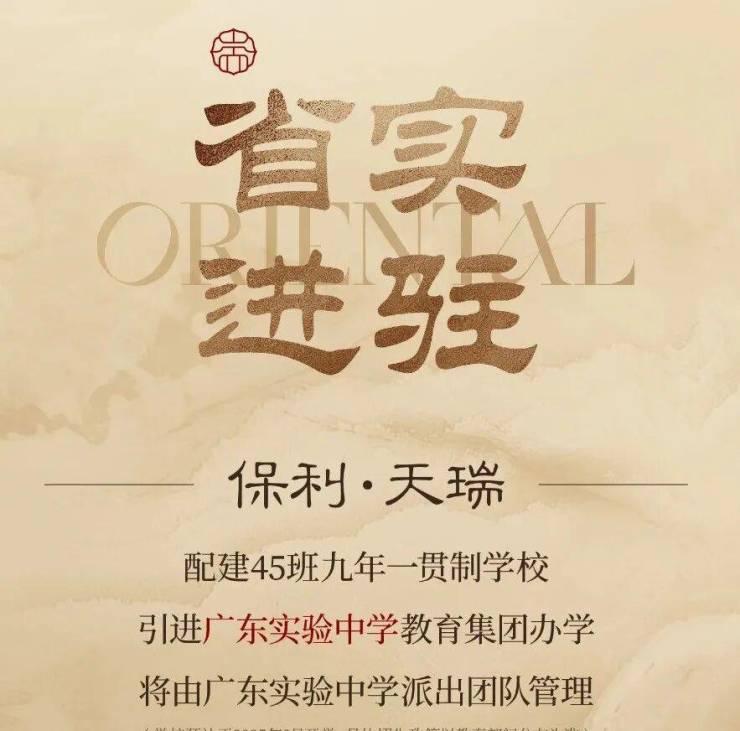 项目配建一所18班幼儿园,以及45班九年一贯制学校,目前该校已官宣引入广东实验中学教育集团办学,由广东实验中学派出团队管理。