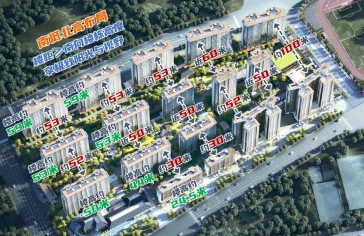层高24.5米-59米,高8-20F,楼间距最小的是30米,最大的达到了100米;