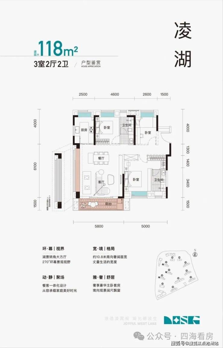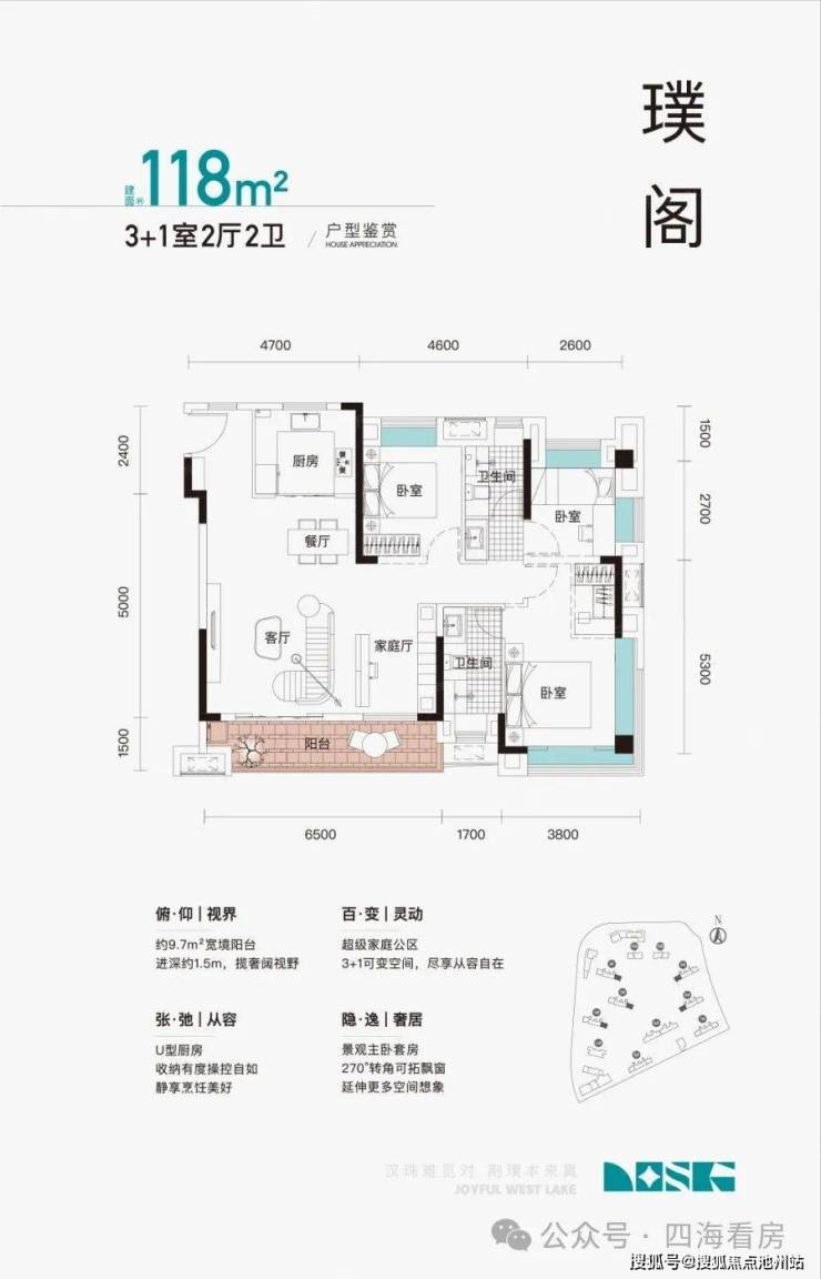 5、户型设计太赞了!每一个看过的人都会忍不住心动!项目目前出来的有3个户型,为100㎡和118㎡,面积不大,刚需刚改都可以轻松入手,绝就绝在设计的太好了!100㎡能做到11.5米的南向大开间,还是横厅设计,绝对有120平的既视感,118㎡户型有2种,一个设计南向大开间,还是3+1的多功能设计空间,一个为了观景,做了客餐厅一体大横厅大飘窗设计,可以实现270°环幕观景视野。