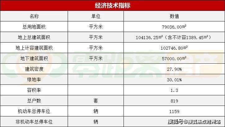 按照批前公示中的经济技术指标来看--项目总用地面积79036㎡,地上总建筑面积104136.25㎡(含不计容1389.45㎡),容积率1.3,机动车总停车位1159辆,车位配比约1:1.4。