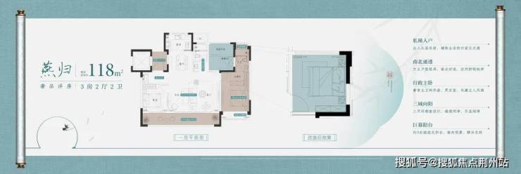 几个户型中,建面约118㎡的户型,是一个大三房的布局,南北通透,采光和通风肯定没什么问题。这个户型的亮点在于--①9米的跑道阳台;②约6米的无柱体大横厅,后期样板间出来大家可以去感受下,视野和改造能力非常强。