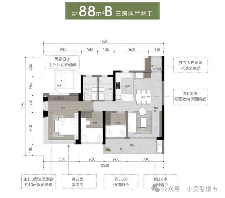 建面88平B户型,四开间朝南,由东南和西南,可打通客厅旁的次卧做成宽6.3米的大横厅,总价218-248万左右。