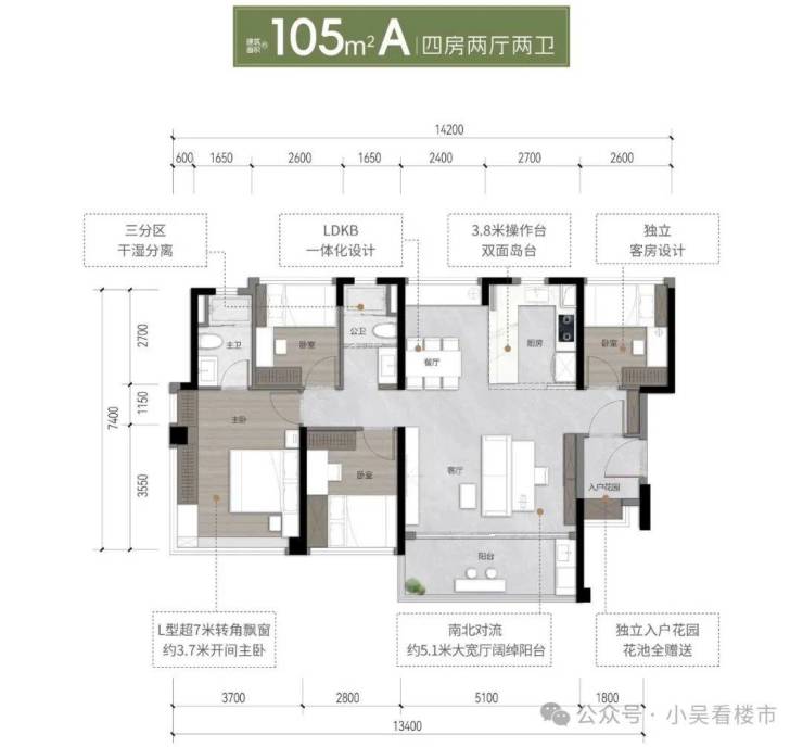 建面105平四房两卫,东北向,位于A9栋,客厅开间5.1米,南北对流设计,总价290-316万左右。