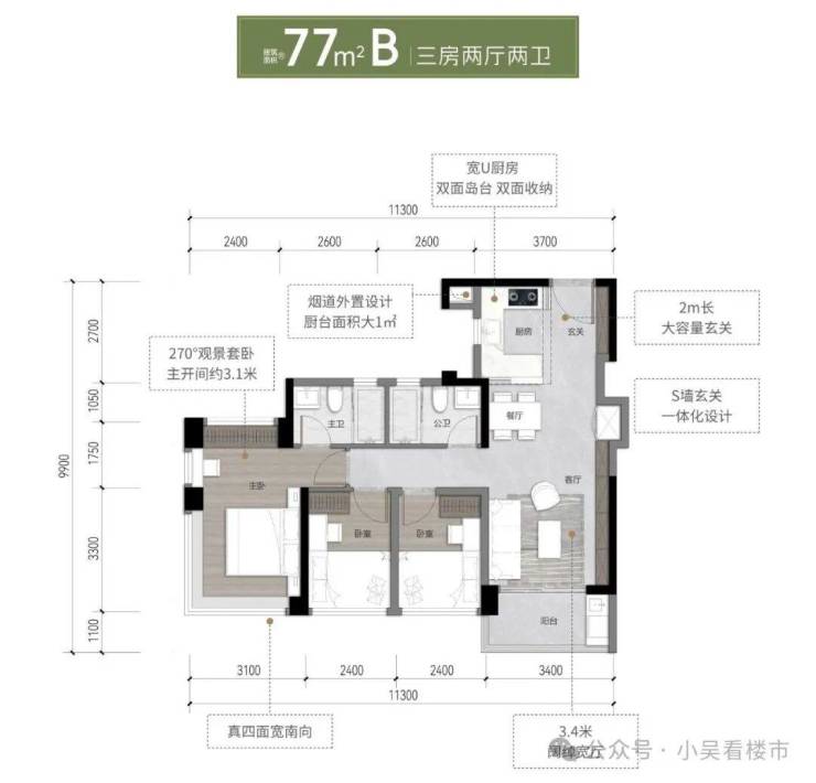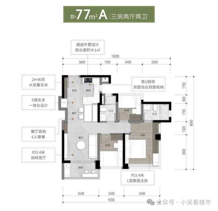 建面77平A户型,东南朝向,位于A9栋,客厅开间做到3.4米,约3.4米L型飘窗主卧,总价190-210万左右。