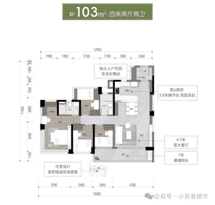 建面103平四房两卫,西北向,位于A1栋,四开间朝南,主卧270度观景,总价255-280万左右。