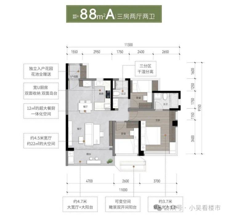 建面88平A户型,LDKB一体化设计,带大景观阳台,约4.7米客厅开间和长阳台,总价218-248万左右。