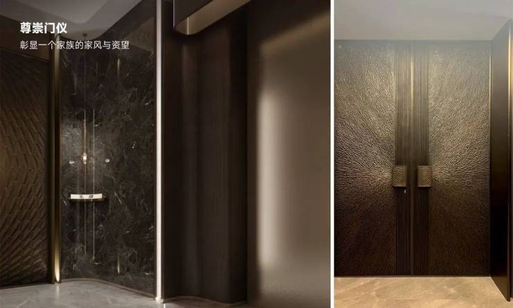 古奇黑、芬迪白、古堡灰、鱼肚灰、孔雀开屏等奢石的运用,每一块都是全球甄选的珍稀石材原料,自带豪奢高级气质,为空间增添无尽的美感与价值。