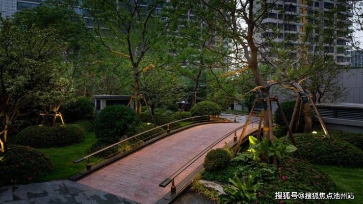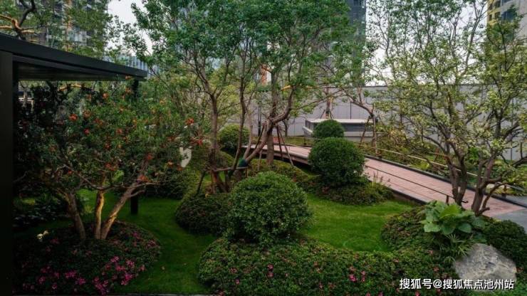 无桥不成园,有桥景更幽。通过造景、对景、框景等手法,在28米归家廊道间实现“步移景异”的沉浸体验。漫步虹桥,桥面起伏所带来的高度差能观赏到几乎所有的名贵树种;樱花、乌桕、海棠、紫薇、红枫等组成的“江南十二时节”植物画卷,尽享叠翠丰茂。
