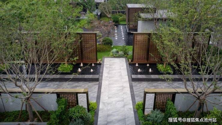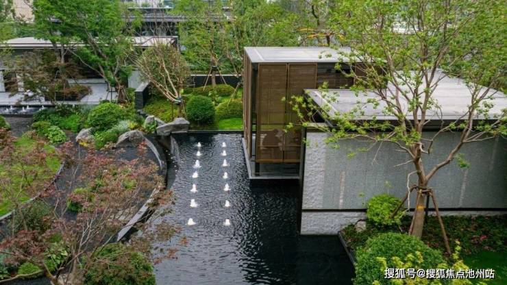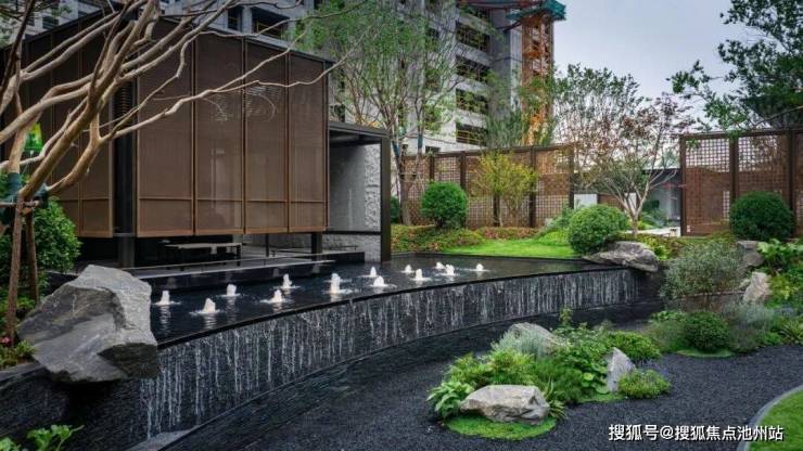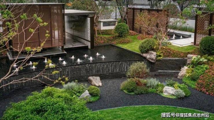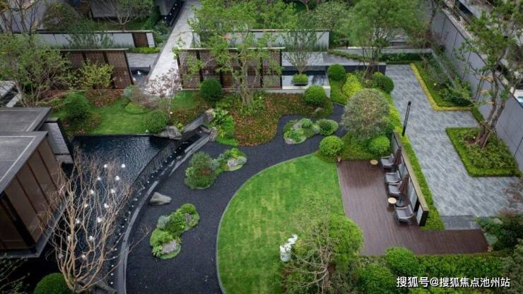 汲取宋代画作中的青绿精华,将其巧妙融入园林景观,打造温婉而高雅的青绿色调,营造“青绿之韵”的视觉主线。精选黑松、红枫等名贵植被,搭配蟒水纹铝板、蓝眼睛花岗石,辅以产自山西的黑山石作为点睛之笔,共同描绘出一个充满东方韵味、流传千年的美学画卷。