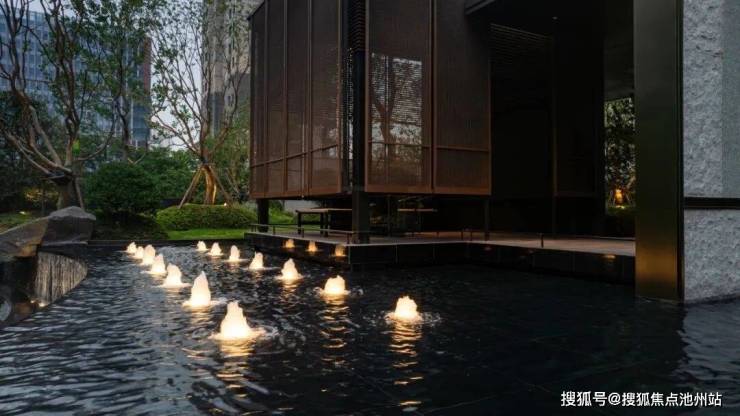 中庭水景格栅墙使用整板铝板定制雕刻,无焊点无打磨;打造15米大型观景桥,从地库顶板开始延伸,高度差形成绝佳观景地带。