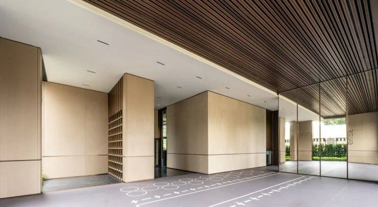 肯定会有人好奇,为何保利不直接使用木饰面?这里,我们可以留意铝板的使用场景:架空层四周没有墙壁保护,日常必须面对风吹雨打,木板很难抵御侵蚀,铝板却能历久弥新。并且,仿木纹铝板拥有与天然木材几乎一致的肌理,在室外也能展示出柔和质感。用造价更高昂的铝板代替木饰面,保利就是这么任性。