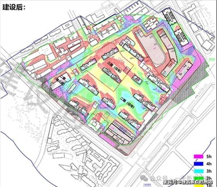 整个项目呈现出北低、南高的建筑趋势,这对于采光会有一些影响,结合项目光照分析图也能看到,2小时内日照的颜色分布范围还是比较多的。