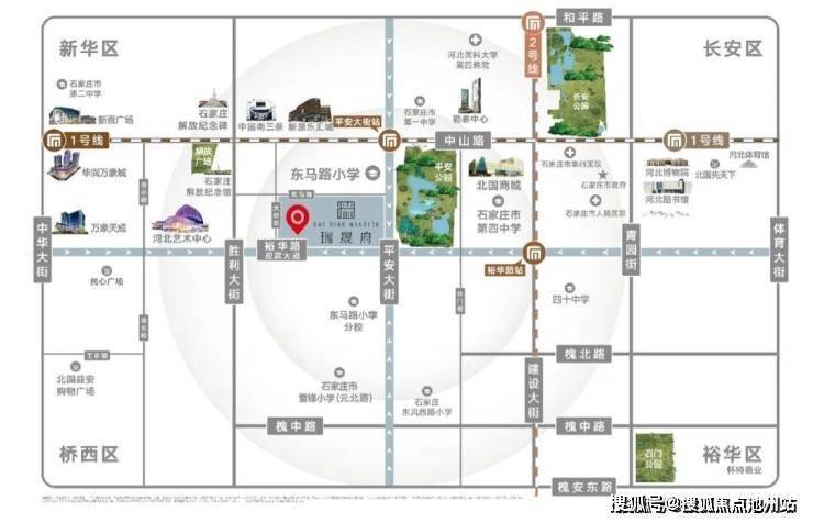 周边直线3km范围内有15个地铁站(平安大街、裕华路、北国商城、解放广场、槐中路、长安公园、东里、博物院、新百广场、欧韵公园、槐安桥、元村、市二中、建和桥、体育场),轨道交通发达,距离最近的地铁站是平安大街。