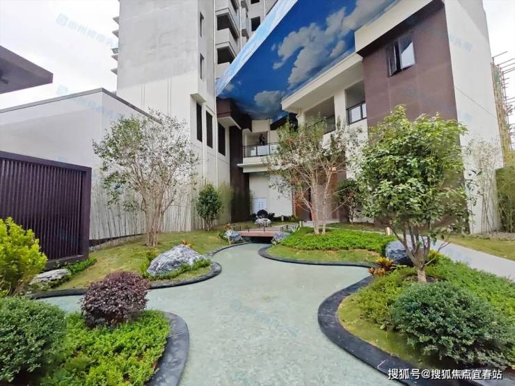 项目体量小,园林自然不大,穿过黑棕色大门,就能看到已经完成的园林一角,水池、绿化都都有,一个刚需小项目打造成这样,还算蛮有诚意的。