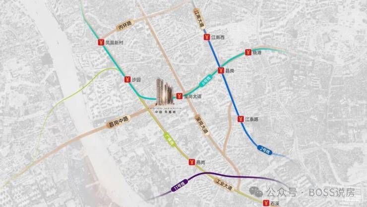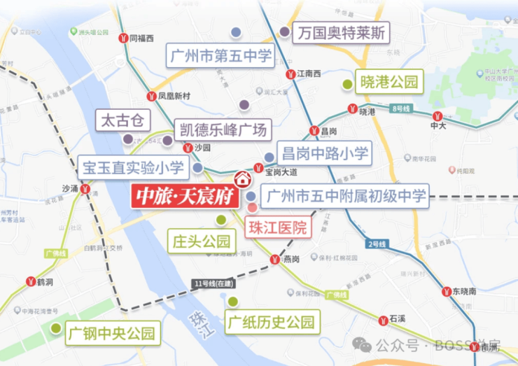 项目距离8号线宝岗大道地铁C出口仅200米,步行5分钟即达,约15分钟直达荔湾陈家祠(6站)、转2号线约15分钟直达海珠广场(4站),约20分钟直达天河珠江新城(7站)。