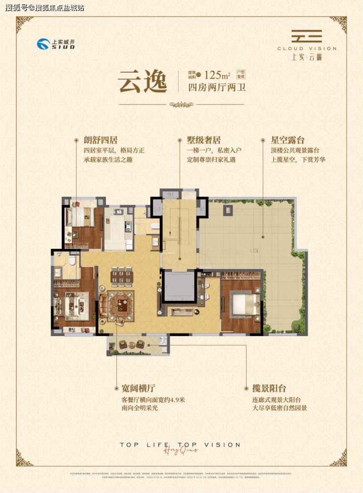户型点评:建面约125㎡4房2厅2卫,一梯一户设计,专属入户空间。该户型做到了四开间朝南+主卧套房设计+卫生间干湿分离,超大南向采光面,室内通透明亮;客餐厅相连,约4.9米大面宽横厅,客厅南连观景大阳台,会客区空间宽奢、大气;主卧套房设计,带独立卫生间和飘窗,专属于主人的私密空间;该户型享受了墅居体验,是三代同堂优质户型之选。