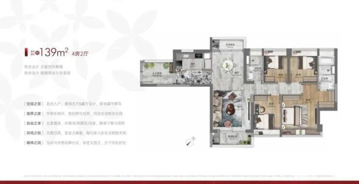 建面139平四房两卫,独立入户花园,大客厅,南北对流双阳台设计,主卧套房带衣帽间,总价550-580万左右。