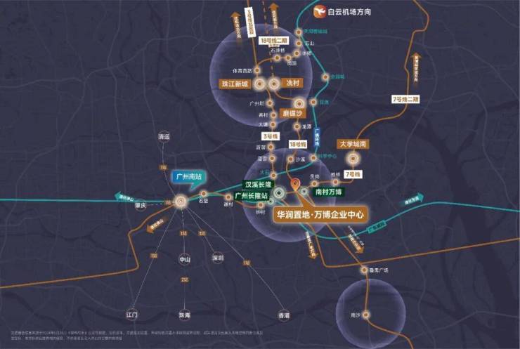 项目踞守“黄金两公里”城市金脊,无缝衔接长隆世界级文旅IP与万博商务核芯,帷幄广州交通枢纽,约1小时联动大湾区主要城市。地铁3/7/18号线在此交织,两站直达珠江新城,为企业铺设一张贯通湾区、接轨全球的效率路网。