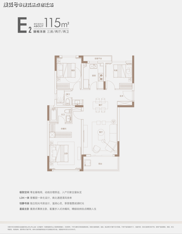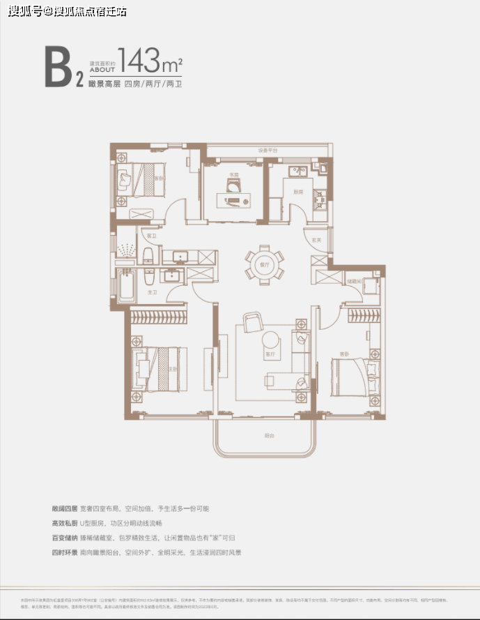 建面约140㎡四房:三开间朝南户型,南北通透,采光条件优质,客厅明亮宽敞,彰显大气布局。