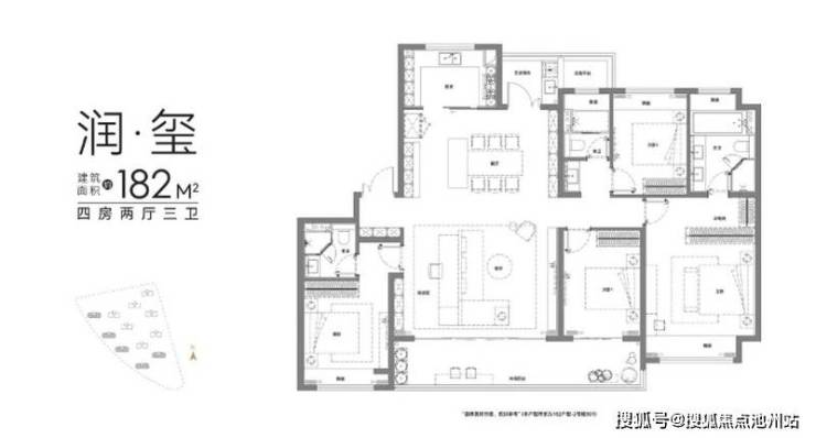 182㎡户型:得房率82%,四室两厅三卫,增设衣帽间与书房,主卧套间进深达7.2米。