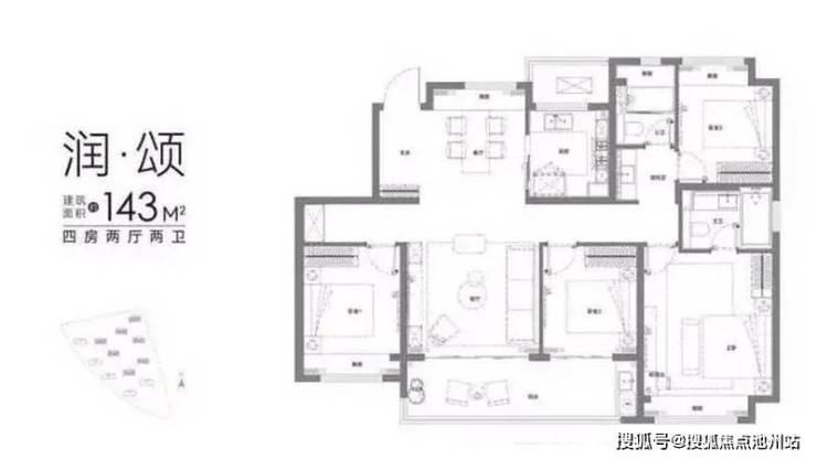 143㎡户型:得房率74%,四室两厅两卫,双阳台+独立家政间;