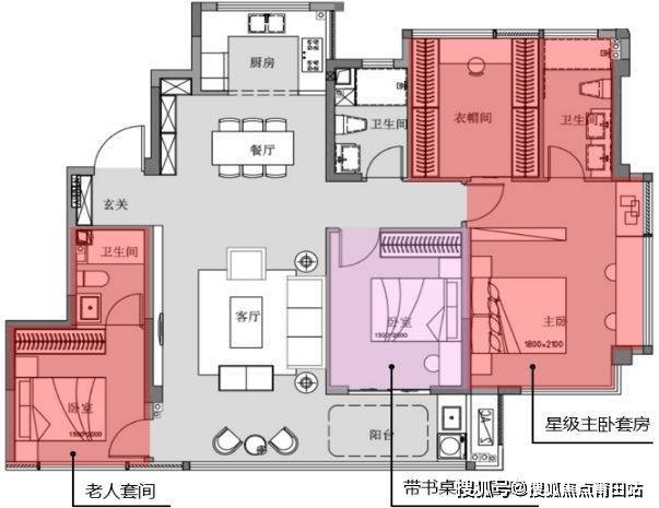 老人次主卧套房:在每个房间均有较为舒适尺度的情况下,比同面积产品多出1卫。特别为三代同堂的家庭量身定制,考虑到老人和孩子的特殊需求,通过户型功能重新划分,为不同年龄段的家庭成员提供了舒适的居住空间。三套独立卫生间的配置,解决了家庭成员早晚高峰时的使用矛盾,特别是在老年人起夜时,免去摸黑的困扰。业主在装修阶段也能更有针对性的定制适老化家装。