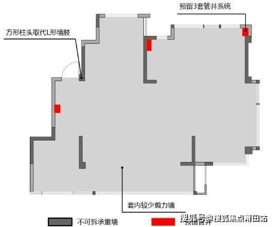 项目结构设计中将承重结构尽量外移,并且尽量用方柱取代传统的L形剪力墙短肢,避免L形剪力墙将内部分隔出多个相对封闭的小空间,削弱了传统户型中因承重墙过多而导致的空间局限性,有效地解放了住宅内部的空间布局,使得室内更具灵活性,为更开阔的空间布局提供了可能。