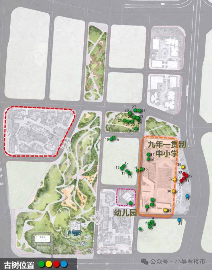 环抱着约11万㎡的古树公园,项目也道法自然,提出了“无界”的理念。教育地块,就环绕古树,做出了许多有趣的设计。