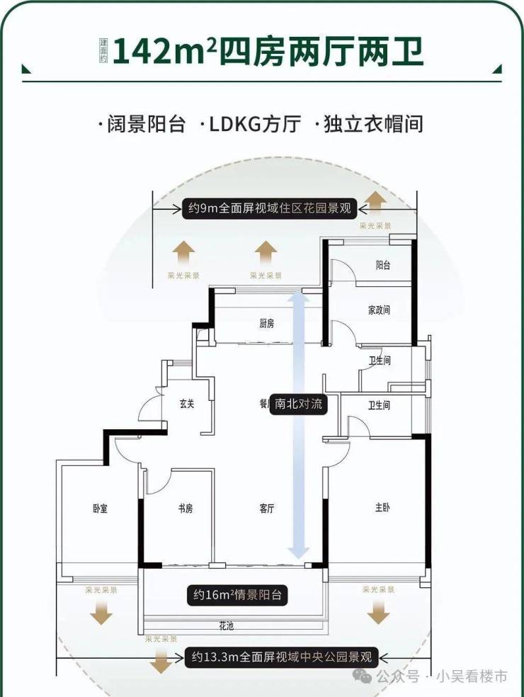 其次,是纯板楼设计,100%南向布局,南北对流。且南向前两排均是小高层,楼间距1.3:1,前后宽阔无遮挡,阳光可以肆无忌惮入室。