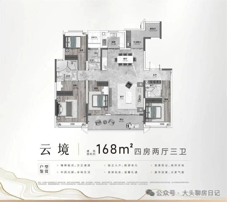 💥 进阶首选,168㎡纯改善四房,板式大平层,专梯入户,约7米超宽阳台饱览一线山景,中西厨设计,满足业主尊贵需求