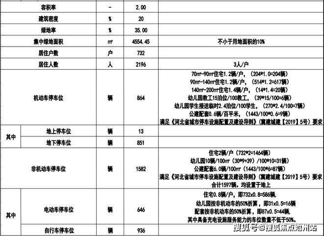 项目规划容积率为2.0,绿地率35%,居住户数732户,居住人数2196,机动车停车位864辆,非机动车停车位1582辆。