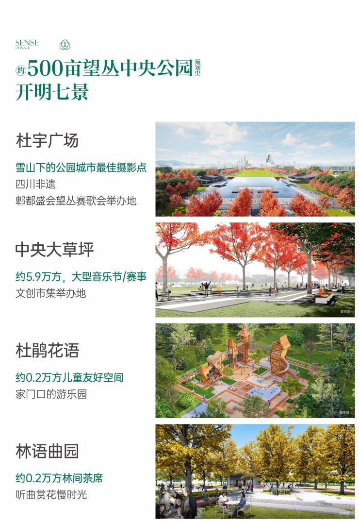 🌱规划杜宇广场、开明广场、杜鹃花语等七大景观节点,包含约5.9万㎡中央大草坪、约1.7万㎡核心水景,未来可承载音乐节、望丛赛歌会等文化演艺活动,融合亲子休闲、文化体验与研学科普功能