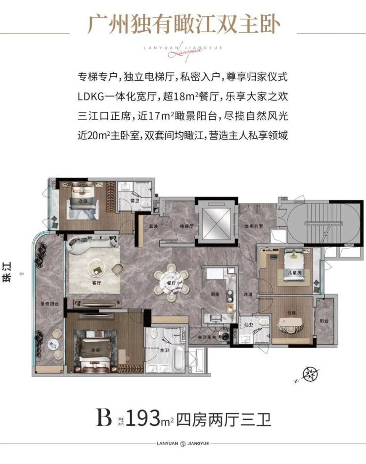 广州兰园江悦(别名:珠江悦府)是位于荔湾区白鹅潭CBD核心的高端江景豪宅,紧邻珠江三江交汇处,坐拥稀缺一线江景资源。项目由亚太顶尖设计团队打造,灵感源自豪华游艇,建筑立面融合柔美线条与珠江水波,营造出流动的艺术美感。
