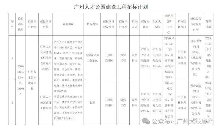 最近,广州人才公园建设招标计划公布,包括建设工程勘察设计施工总承包和建设工程监理,预计总投资2.45亿。