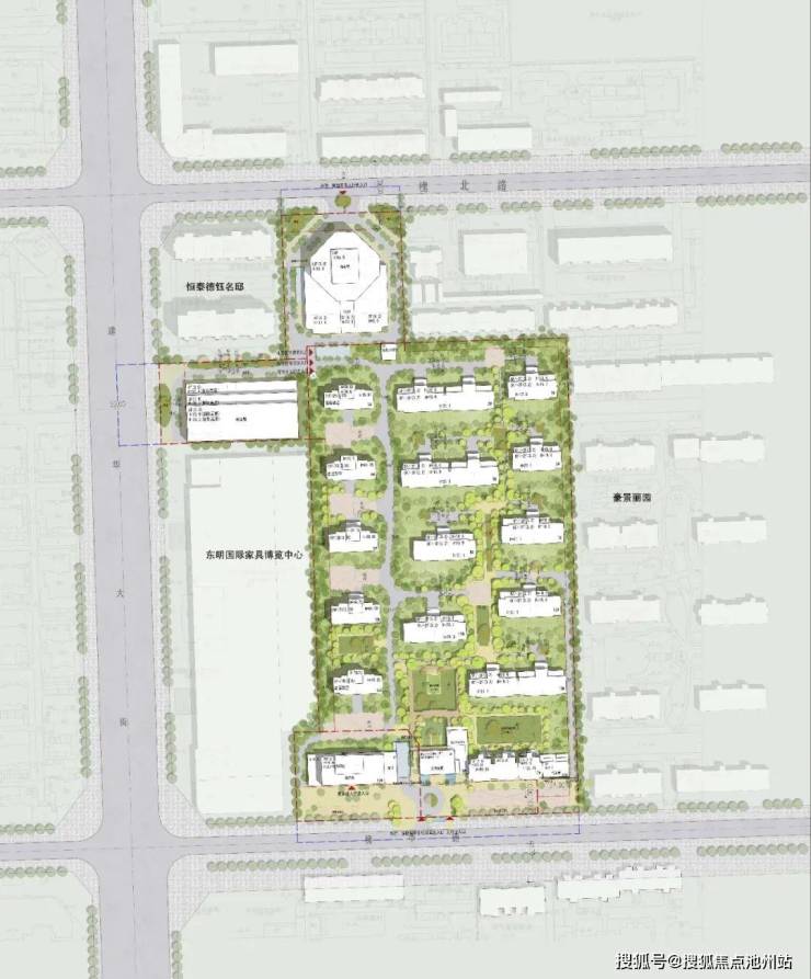 尊重区域的原有城市肌理,有策略地布置高层和多层建筑,与周边建筑和谐共生。多层住宅放置在基地东侧,减少对紧邻现状住宅小区的压迫感和日照影响;西侧临近繁华的建华大街,设置一排高层建筑;西南角第一栋造型时尚的商务楼最高,锚固了项目在城市中的标志性;后面五栋高层住宅楼高低错落,顶部收退,使得天际线富于变化有韵律,又与城市风貌相统一。