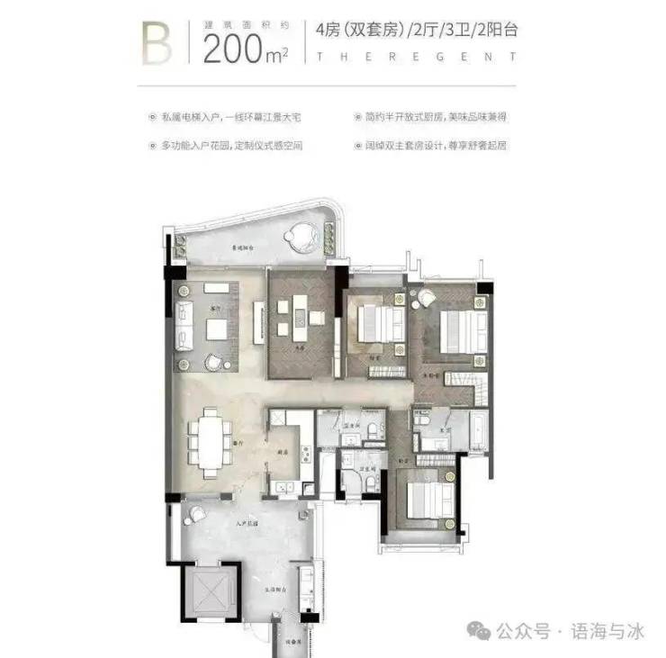 『天启』组团面积约140-250㎡环幕临江大平层,坐拥江景第一排,眺望小蛮腰,享500米宽阔无遮挡江景视野,并邀请三大全球知名设计大师倾力打造,并配备12大国际一线品牌交标,专梯专户四房双套房设计,世界灵感前沿作品礼献广州!