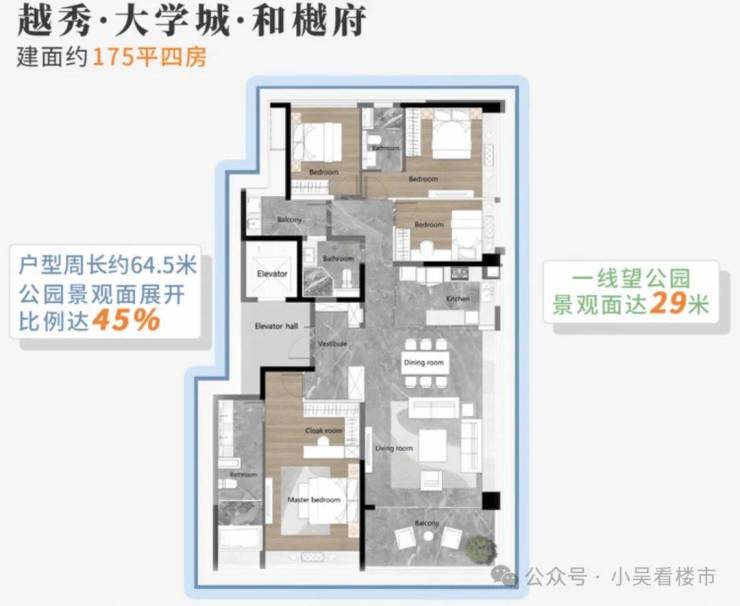 建面175平四房三卫,全屋拥有29米的一线公园景观面,LDKG大通厅,面积约64平,270度全面边厅设计,公园景观面达到29米,总价950-1100万左右。