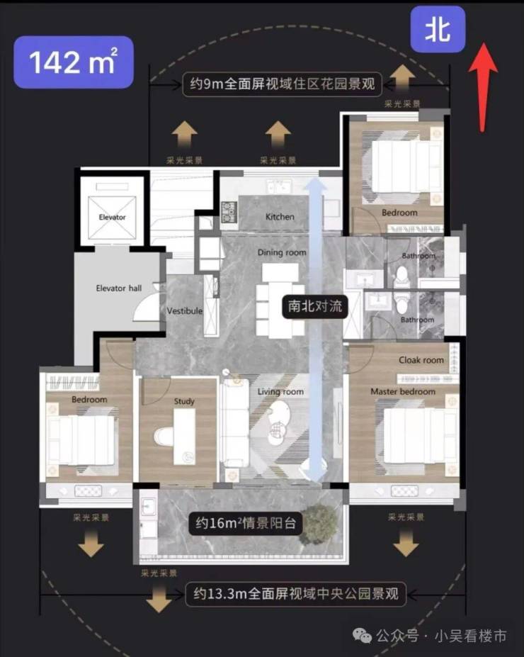 建面142平四房两卫,四开间朝南,面宽14.8米,南北对流,LDK餐客厅一体化,阳台面积约16平,私享电梯厅入户,总价640-720左右。