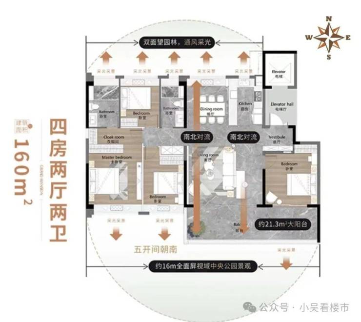 建面160平四房两卫,独立电梯厅,五开间朝南,270度转角阳台,面积约21.3平,中西式可开可关厨房,总价700-780万左右。