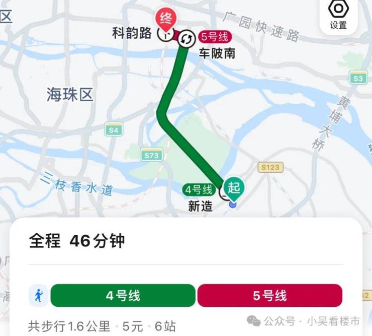地铁去往珠江新城:小区步行至4号线新造站坐5个站到车陂南换乘5号线,全程10个站到珠江新城,耗时57分钟左右。